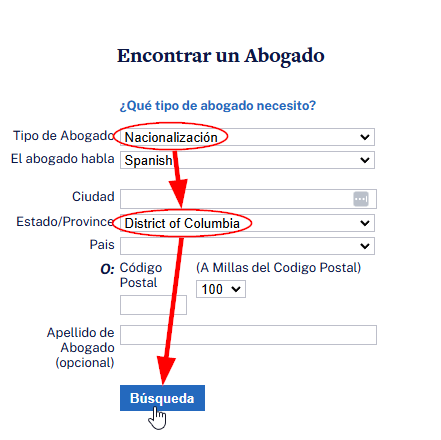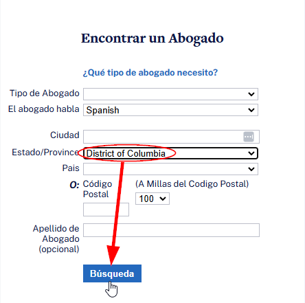 Para limitar su búsqueda, agregue términos de búsqueda adicionales. Por ejemplo, para buscar a todos los abogados de AILA que se especializan en naturalización en el área de DC, elija "Naturalización" en el menú desplegable en el campo Tipo de Abogado, "Distrito de Columbia" en el menú desplegable en el campo Estado/Province, deje los demás campos en blanco y haga clic en Búsqueda.