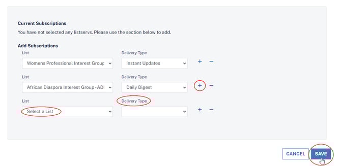 Choose the listserv of the Interest Group you wish to join and one of two delivery methods: Instant Updates or Daily Digest. Save any changes when you're done.