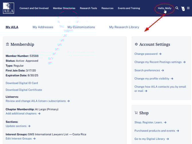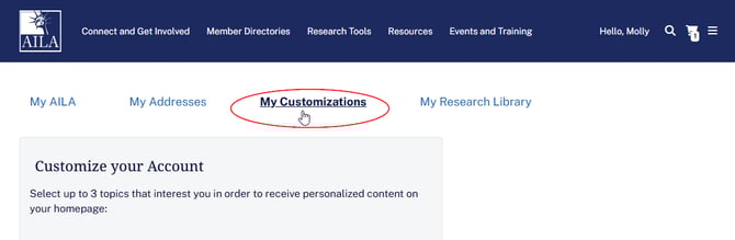 AILA.org is a member's hub for managing their own membership. Navigate to your My AILA page by logging in and clicking the welcome message at the top-right. Use your My AILA page to update your contact information, listserv settings, Sections, and communication settings. Customize what you see on the AILA.org homepage by clicking "My Customizations" and then choosing the 3 topics which most interest you. From your My AILA page, you can also manage your volunteer committee involvement, demographics information, research library, and more.