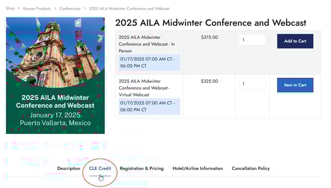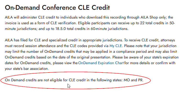 AILA National events will always include a description of CLE credit available for the event on that event's registration page. Log in to AILA Shop, navigate to the event, and click on "CLE Credit" to review that event's CLE credit details. Jurisdiction(s) ineligible for CLE credit for the event will be listed here.
