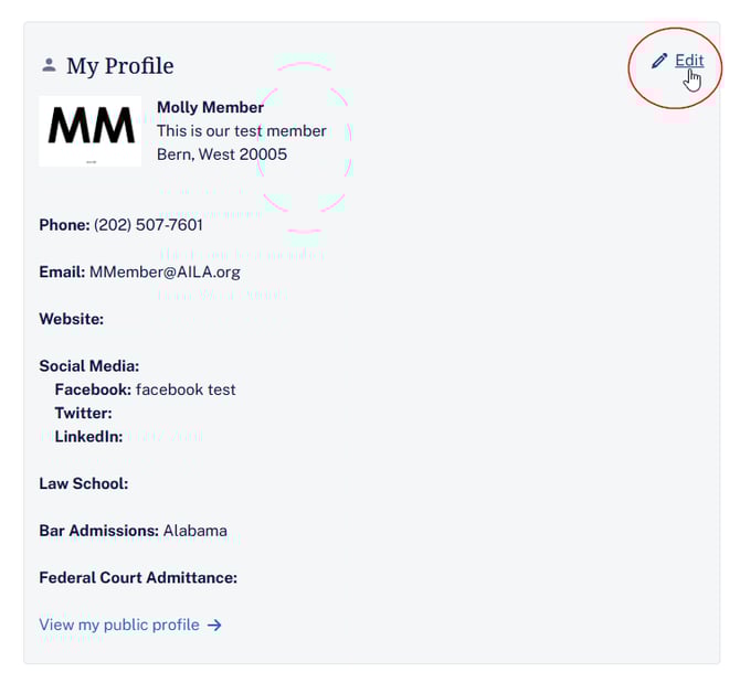 Scroll down from your My AILA Page and click Edit near the top-right of the "My Profile" pane.