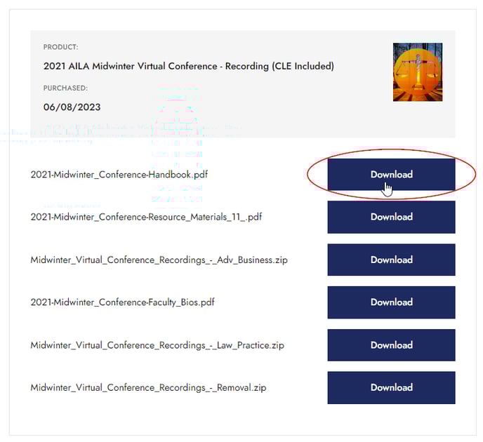 Review the list of purchases and click the blue "Download" button beside the items you wish to download.