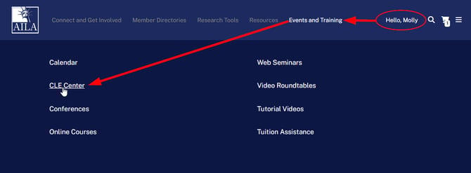 Log in to AILA.org, click on "Events and Training" from the top menu, and then on CLE Center from the drop-down menu.