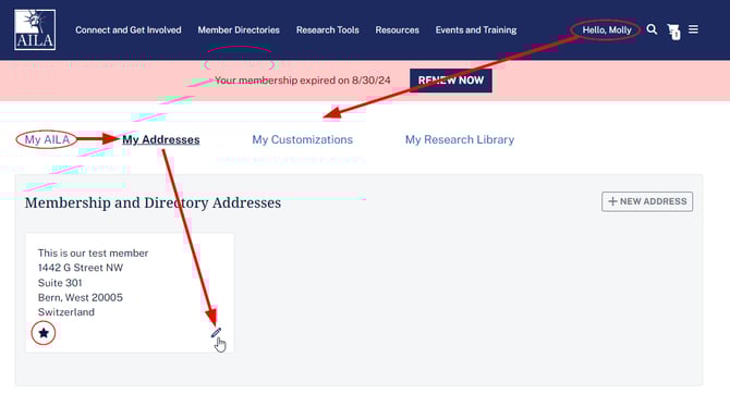 Log in to AILA.org and click on the welcome message at the top-right to open your My AILA Page. Click on "My Addresses" near the top of the page, then on the Pencil icon at the bottom-right of your mailing address in the "Membership and Directory Addresses" pane. If you have more than one mailing address, be sure that you're updating your primary mailing address by looking for the star icon at the bottom-left of the address.