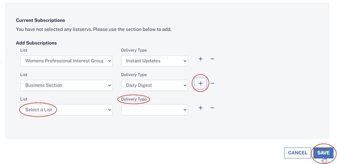Choose the listserv you wish to join and one of two delivery methods: Instant Updates or Daily Digest. With Instant Updates, you'll receive messages from that listserv instantly as they are sent. Daily Digests are a once-daily email which summarizes all of that listserv's activity for that day. Daily Digests are in Text format only and do not include any attachments that were posted to the individual listserv emails for the day. If attachments are important to you, please ensure the delivery method is set to Instant Updates instead. To join multiple listservs, click the plus button (+) and make your selection on the new line. Be sure to save any changes when you're done.