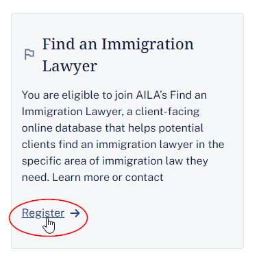 If you qualify, register through your MyAILA page. Log in to AILA.org, click on the welcome message at the top-right to open your MyAILA page, scroll down to "Find an Immigration Lawyer" and click on Register. Follow the prompts to complete your registration.