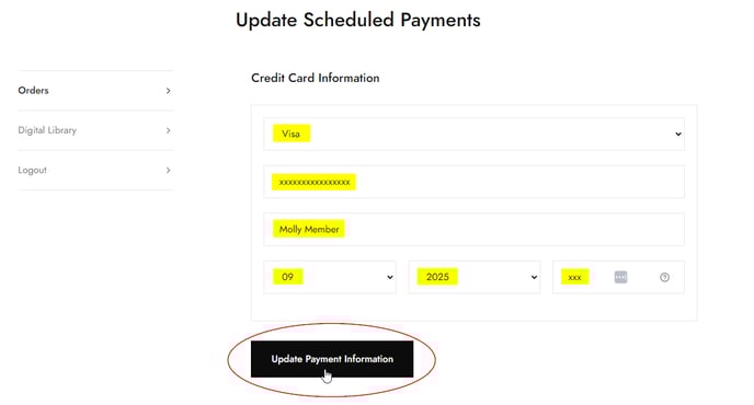Enter the card type, card number, the name on the card, the card's expiration date, and the card's CVV code. Click "Update Payment Information" when you're done.